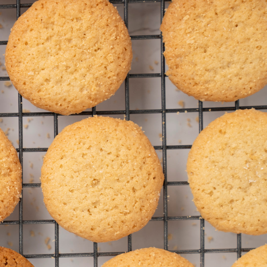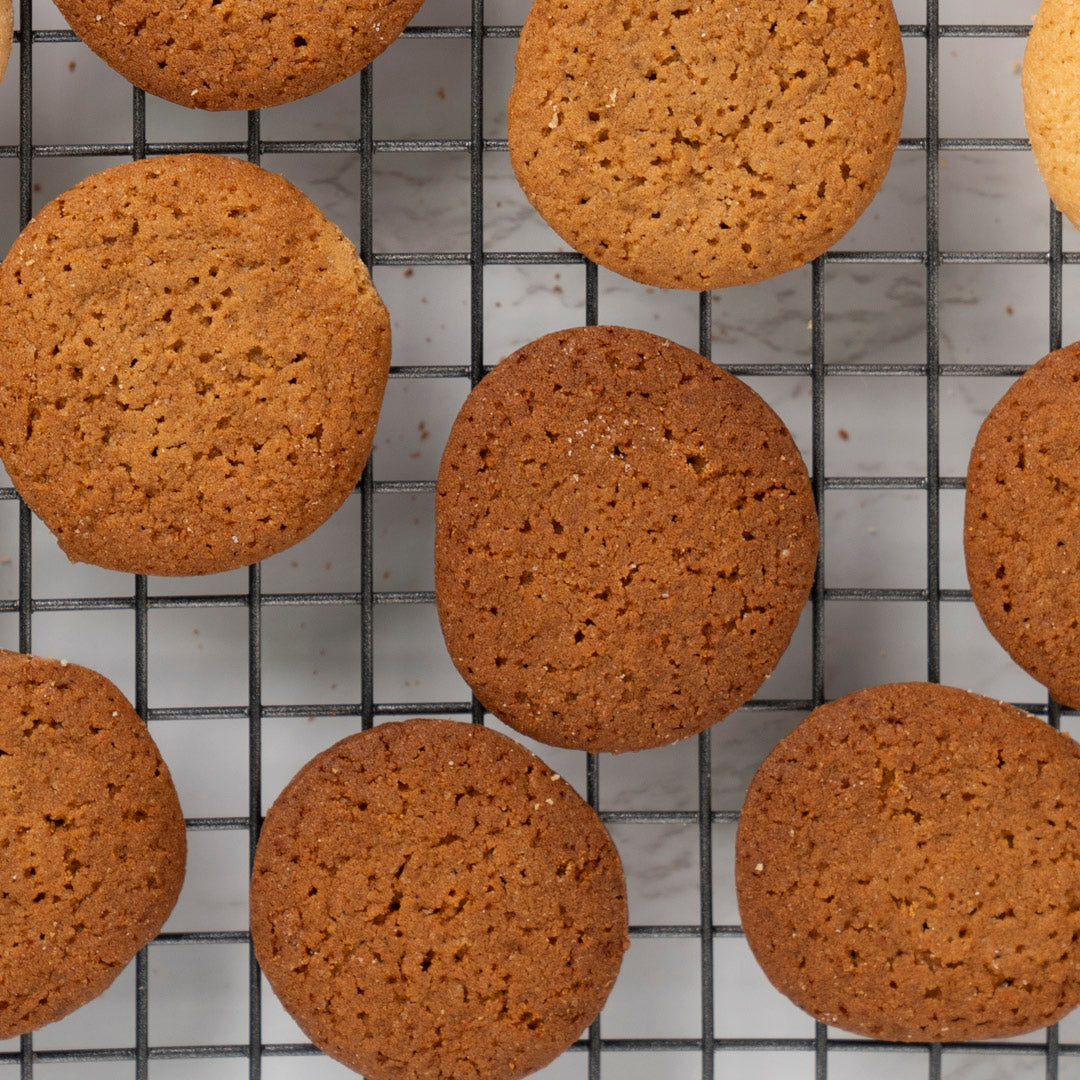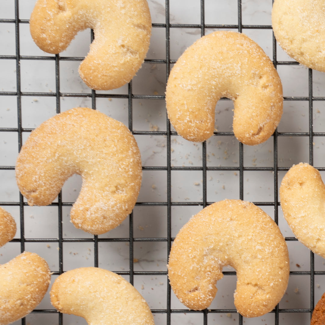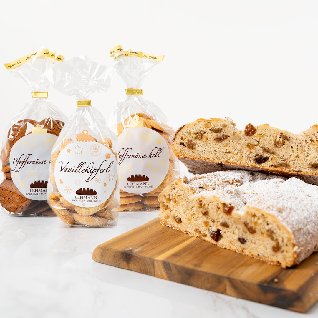 Genieße unseren leckeren Butterstollen und drei köstlichen Sorten Weihnachtsgebäck – Pfeffernüsse Hell, Pfeffernüsse Dunkel und Vanillekipferl.